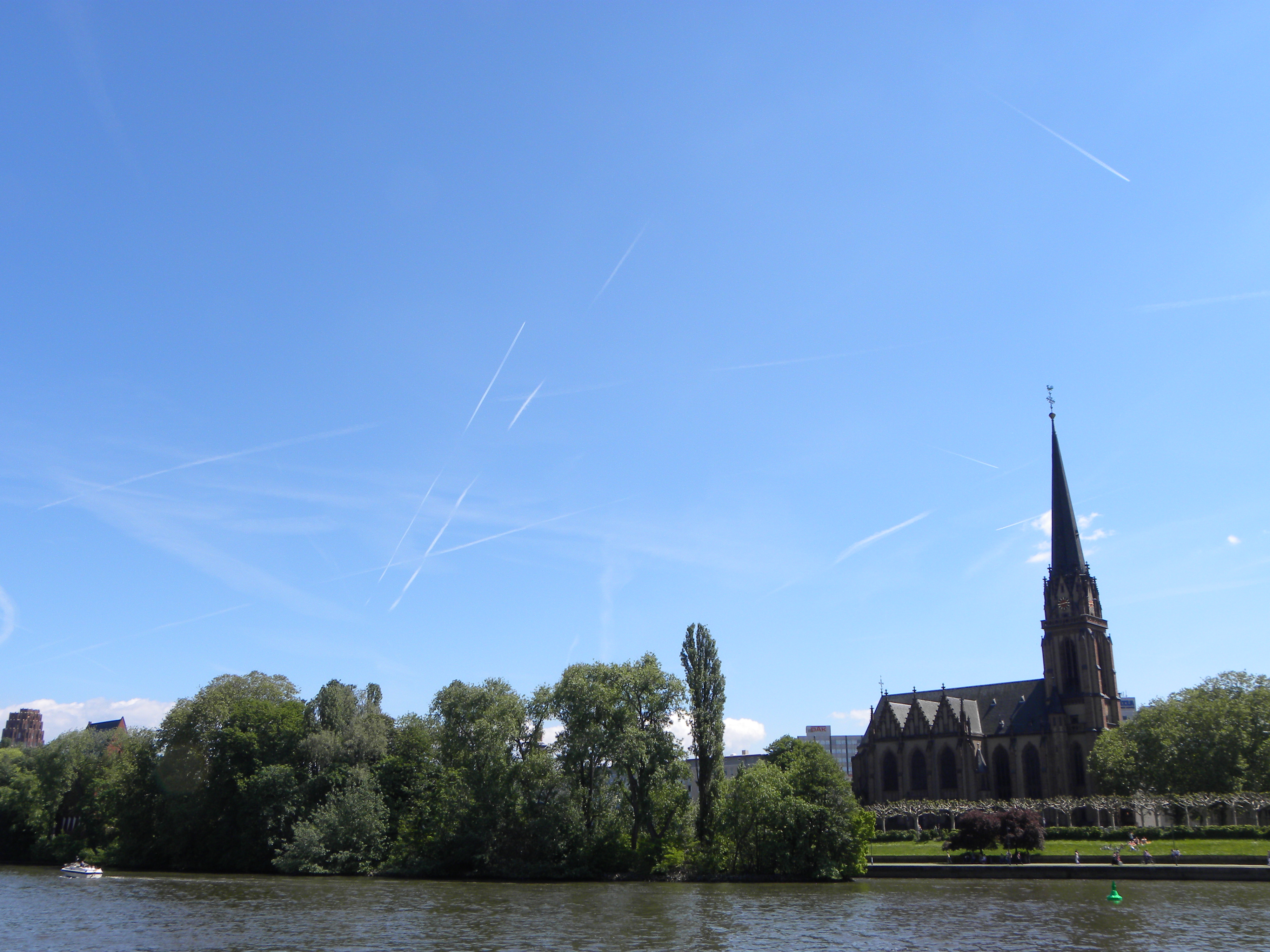 Y de repente me emociono acostado en un banco a orillas del Main al ver el cielo azul (no tan intenso como en el Mediterraneo a pesar de estar limpio) lleno de lineas blancas, como si hubieran sido trazadas con una regla, dejadas por los aviones que van vienen o cruzan la ciudad.