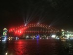 Las conchas blancas de la opera, el puente de la bahía, el mar, los barcos y los fuegos artificiales.